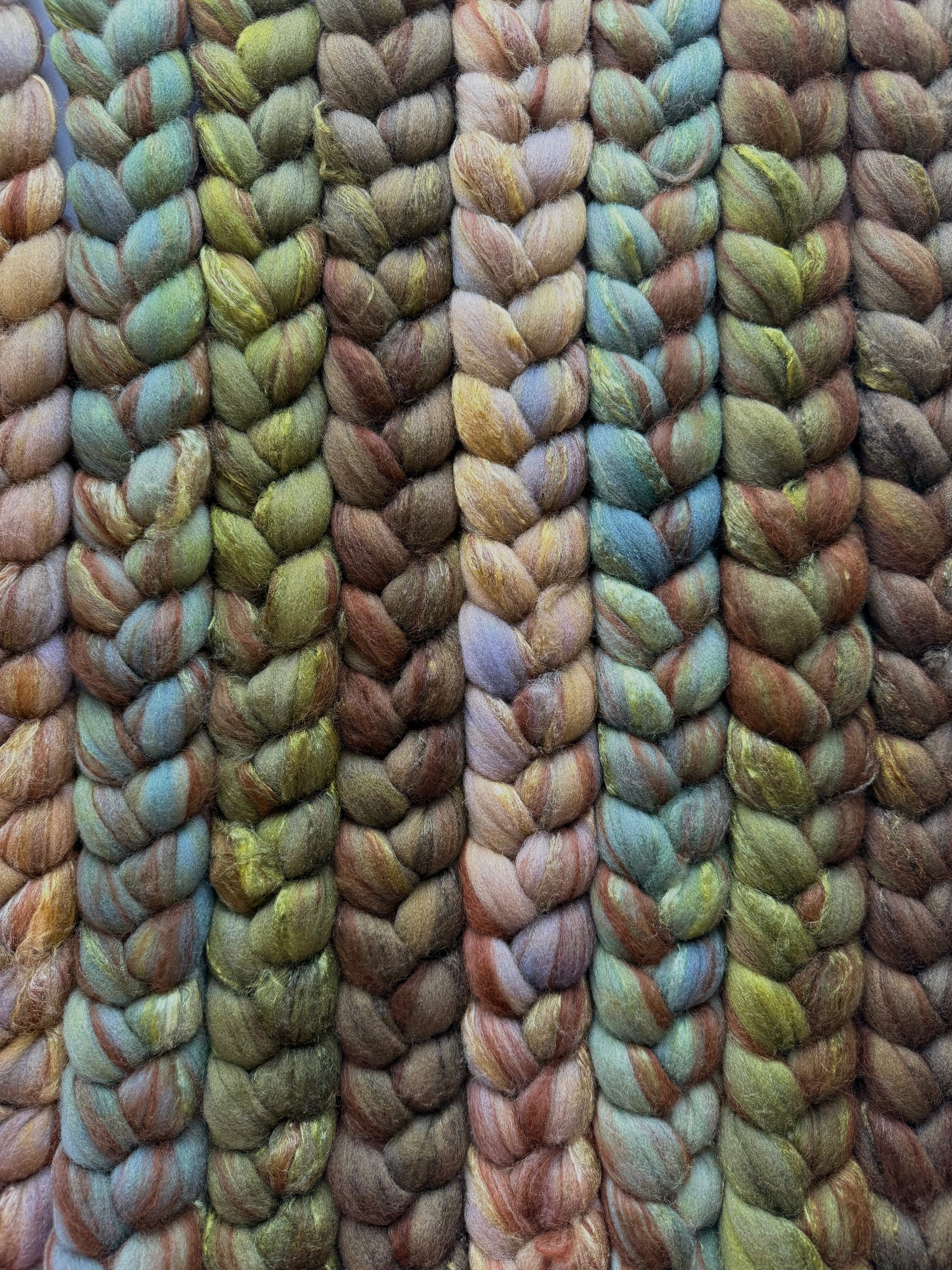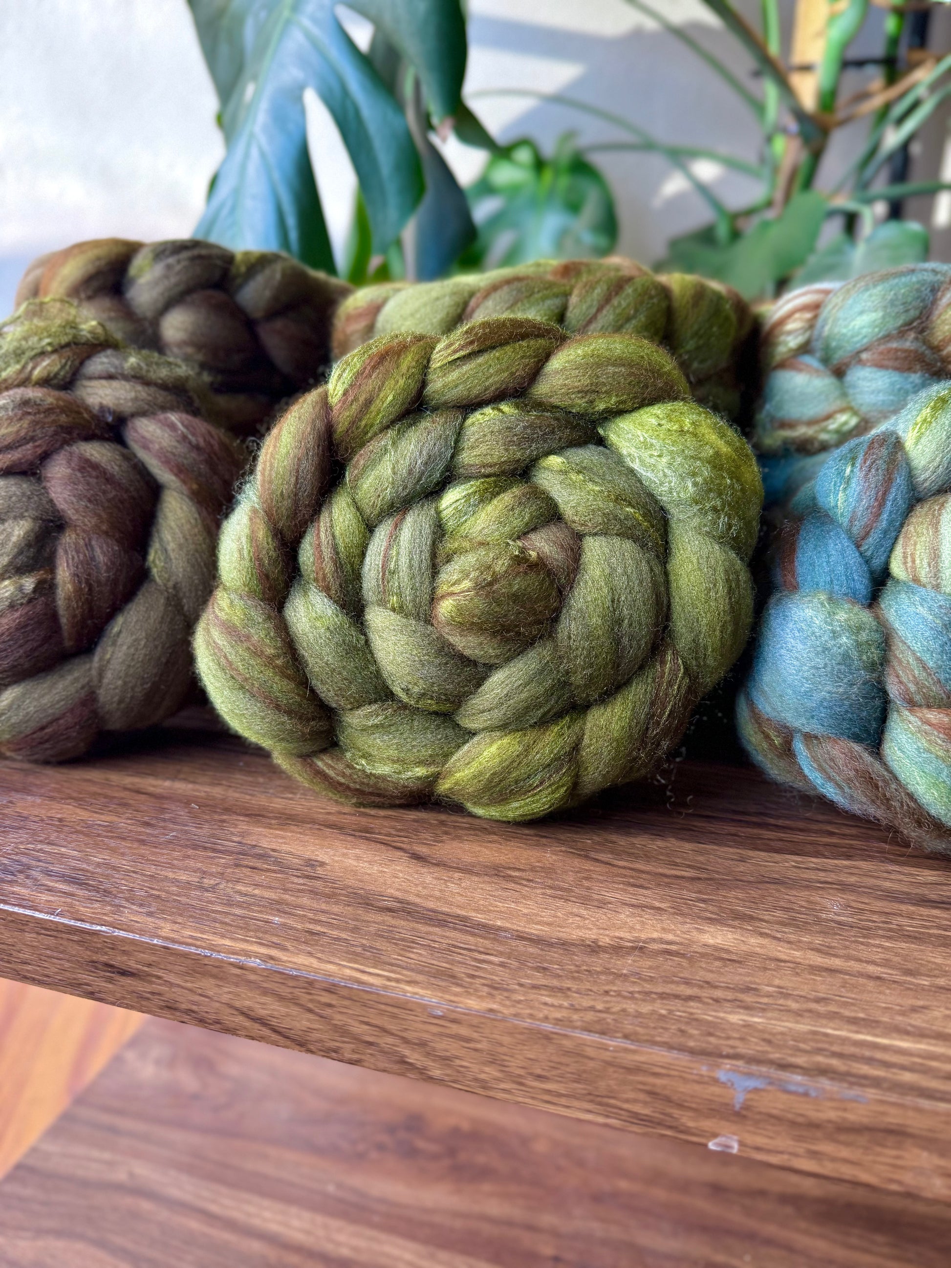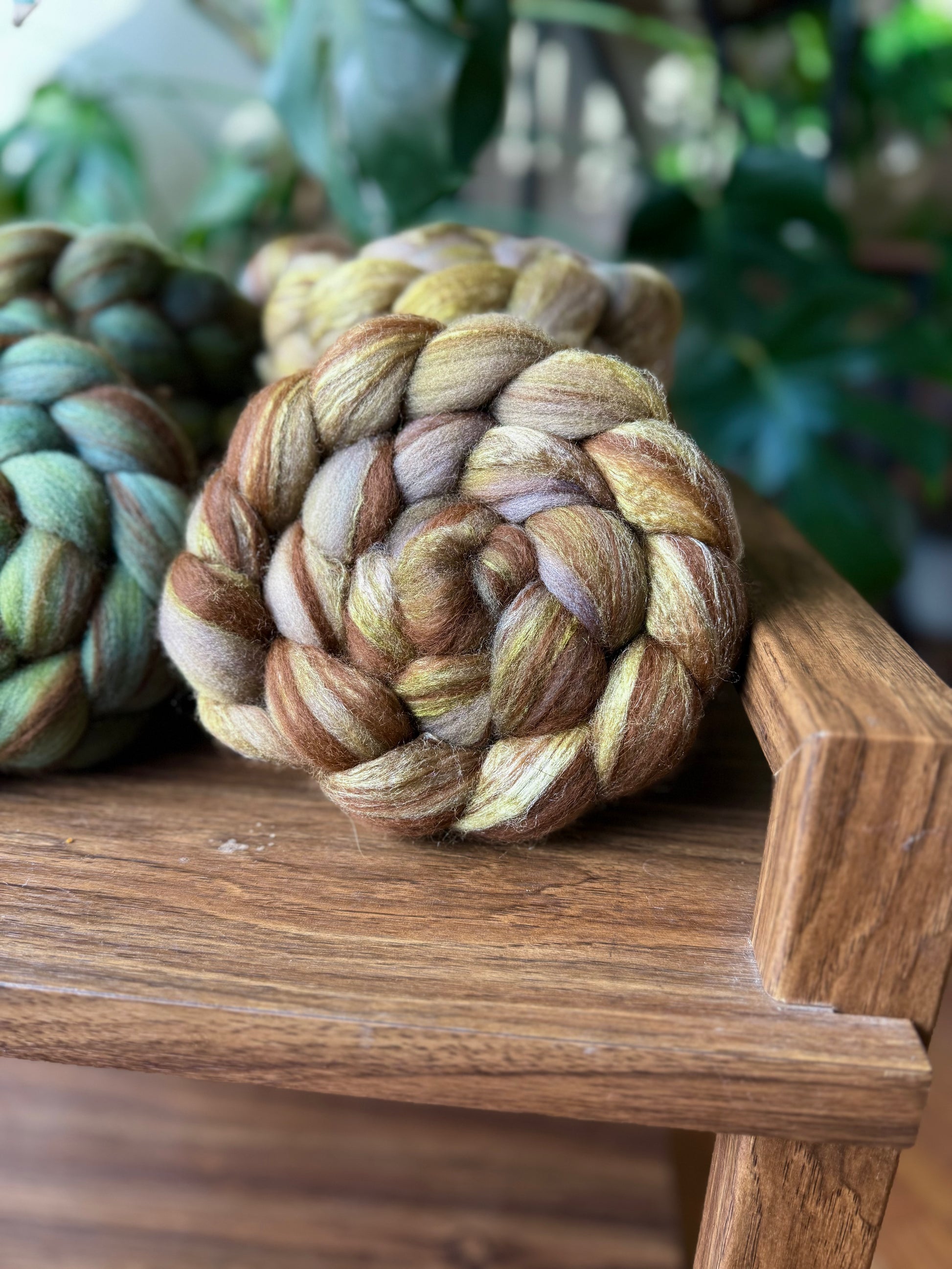 This blend is 67 percent Cormo, 17 percent Silk, and 16 percent Alpaca. This blend should be considered for intermediate spinners since the different fibers are lightly blended. I would not recommend this one for a true beginner. It spins up beautifully into a gorgeous bouncy yarn with hits of metallic shine where the silk is spun into it.