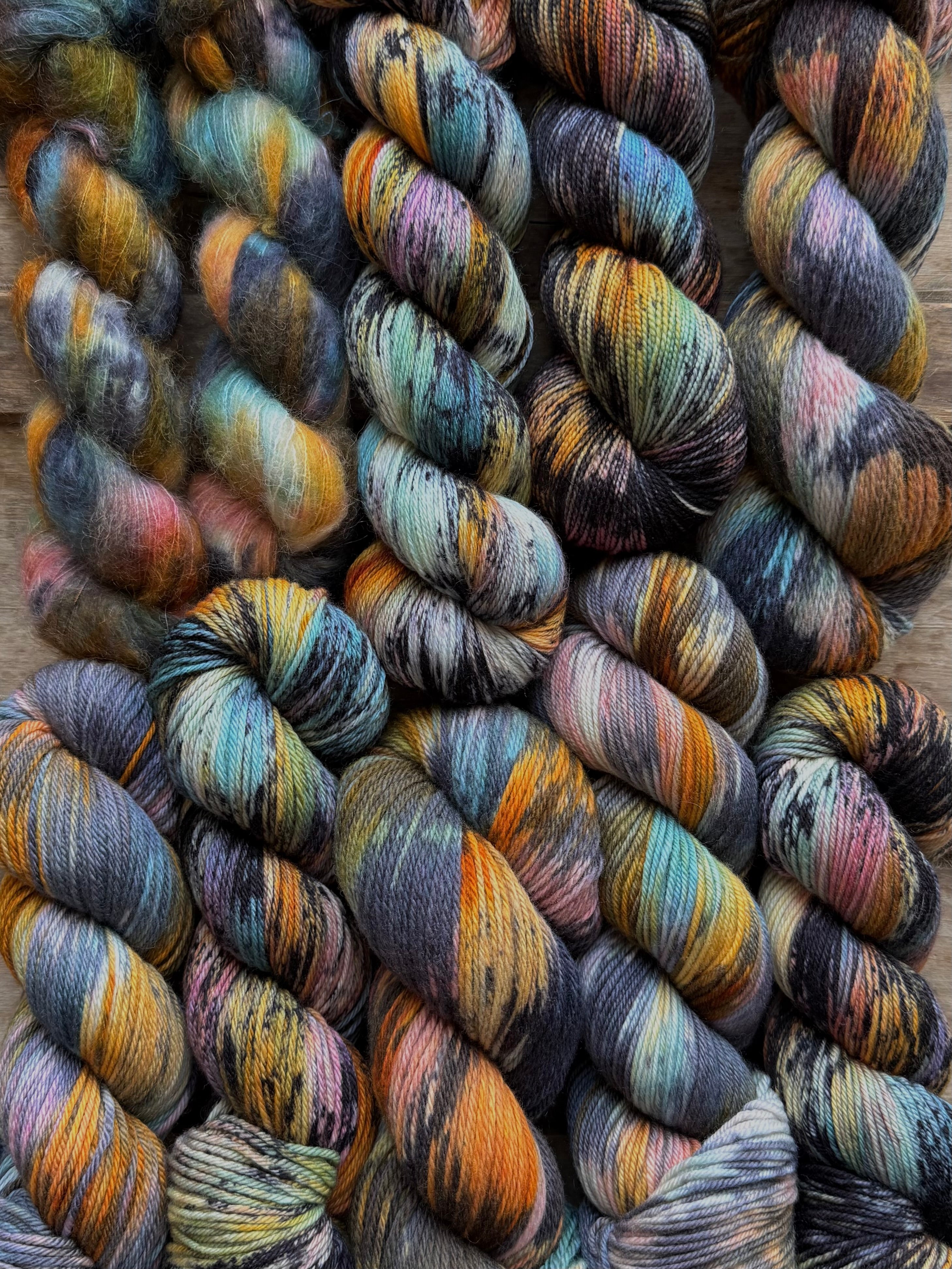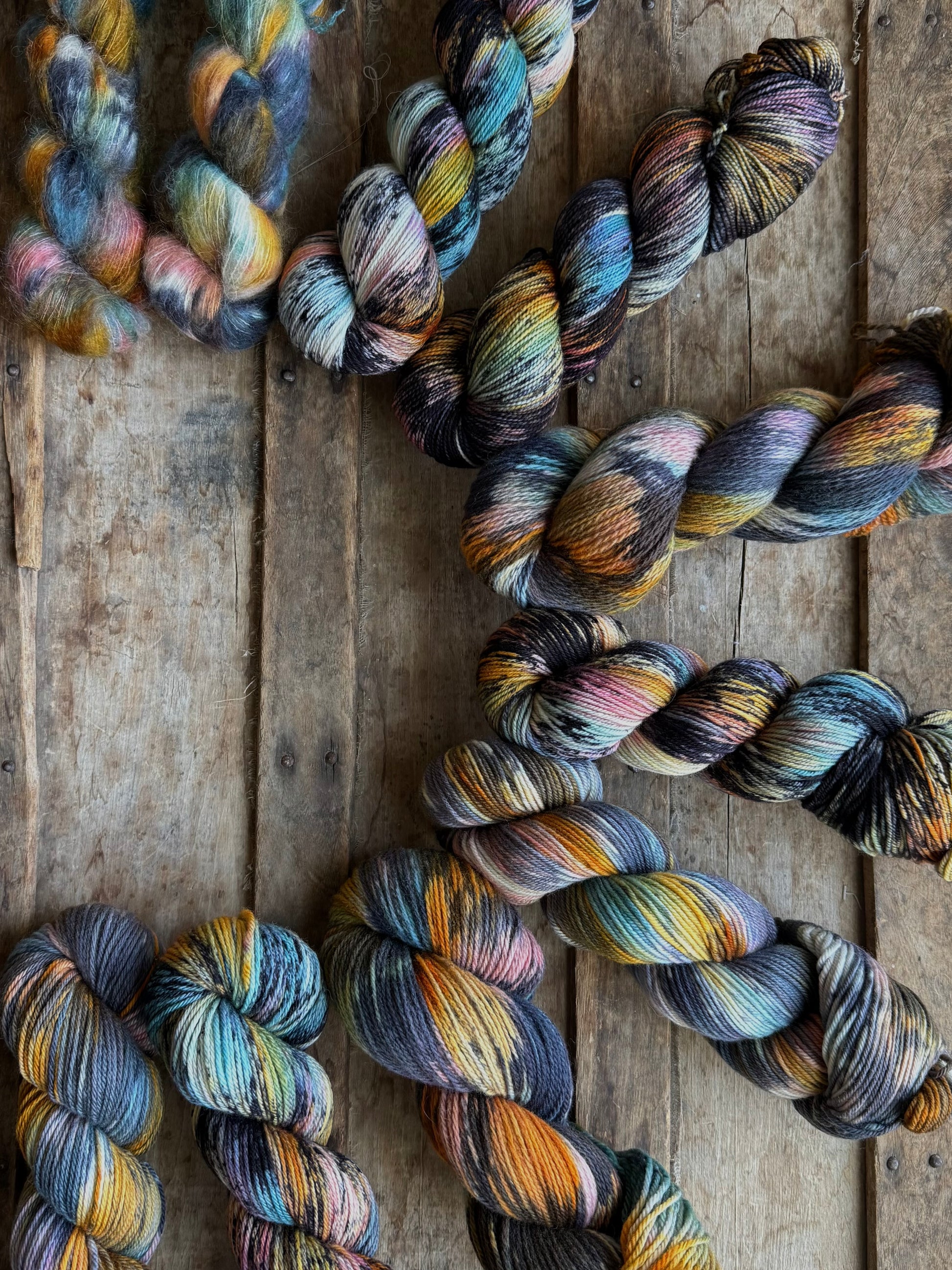 This variegated starts with a base of blue, pink, yellow, and orange and is finished with a heavy handed black speckle.
