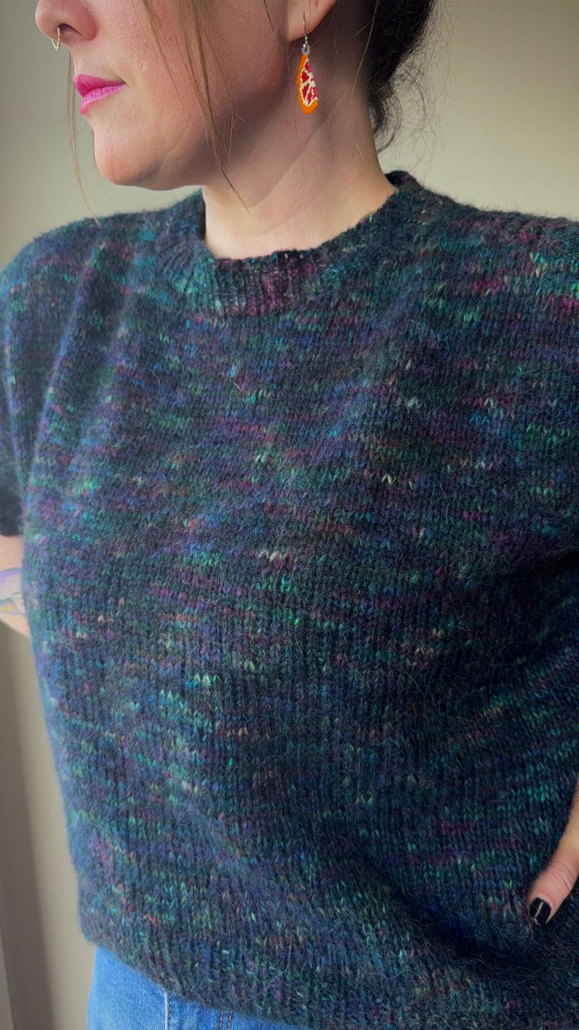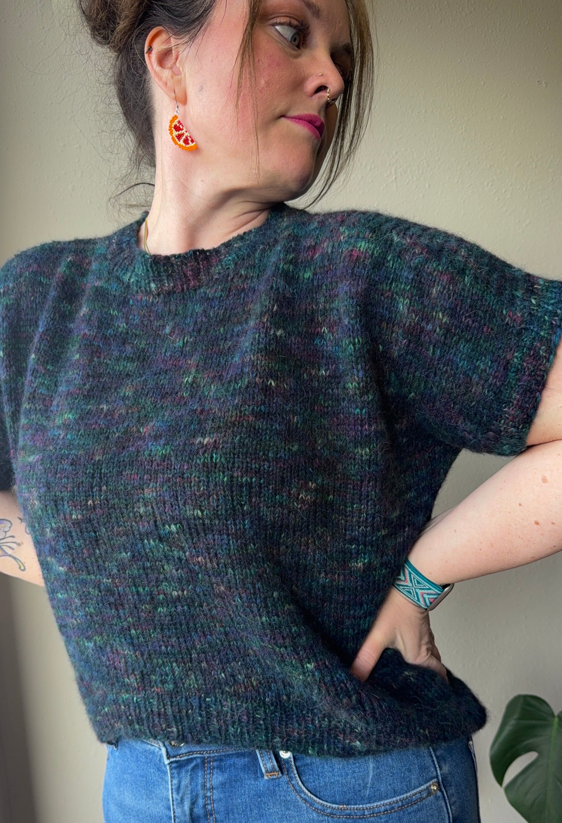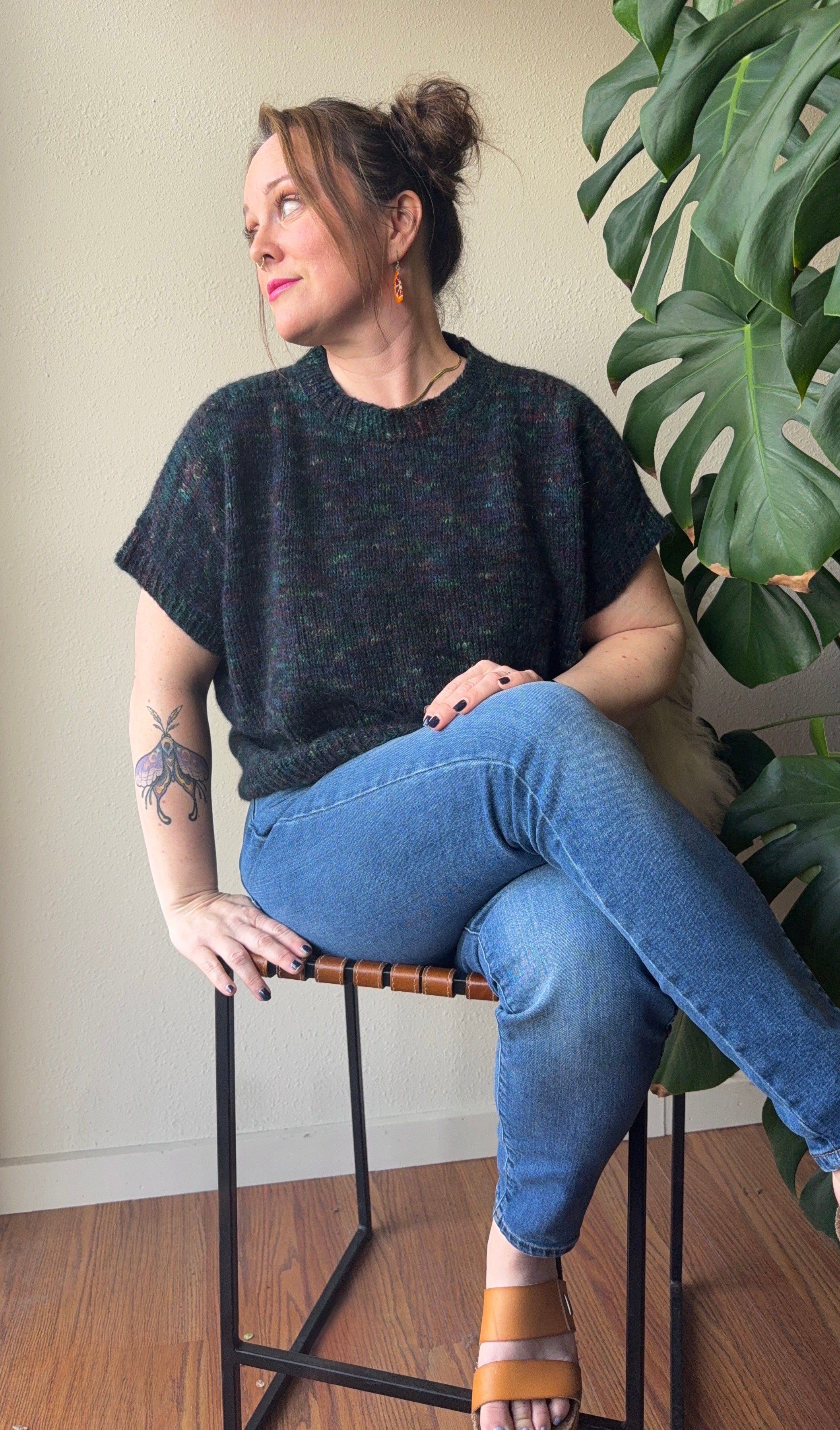 We held two strands of our Classic Suri together. You'll definitely want to gauge swatch (we had to go up a needle size or two to get gauge). I have broken the listing into Short Sleeved and Long-Sleeved options and then into the size that you will need. I have listed the sizes below. Keep in mind that Andrea recommends between 10-24 inches of ease from your bust measurement for this one. I went with 12 inches of ease on mine!
