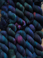 Rattle the Stars - our best-selling colorway of Throne of Glass. This gorgeous variegated is mostly black with hits of emerald, purple, and blue. Almost like a night sky with auroras.