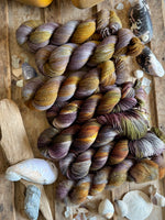 Wrackline is an absolute jewel in this collection. Inspired by the wrack line on the beach - a place where the hide tide has left a field of debris with seaweeds, shells, rocks, driftwood, and all manner of treasures. Wrackline uses deep umber and seaweed greens with charcoal grey, navy grey, and jewel purples to create this gorgeously dynamic yarn where each stitch is a different color!